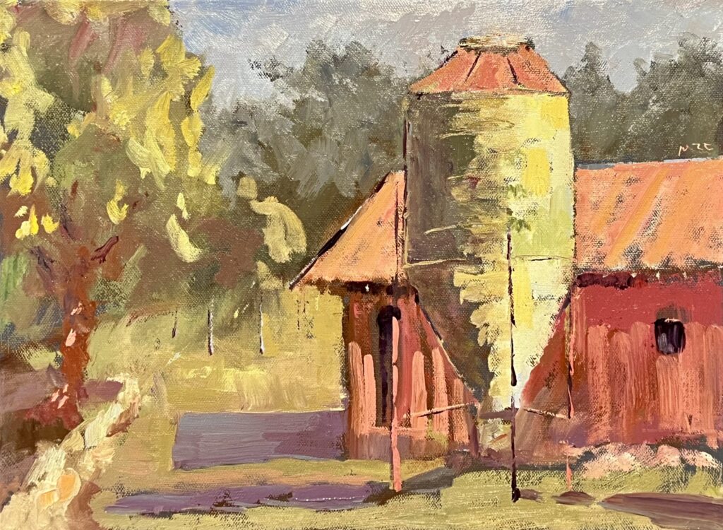 “5PM at The Strouds” oil on canvas 12×16”, is on display at the Thomas Stevens Gallery, Hillsborough NC, until November 8, 2025.